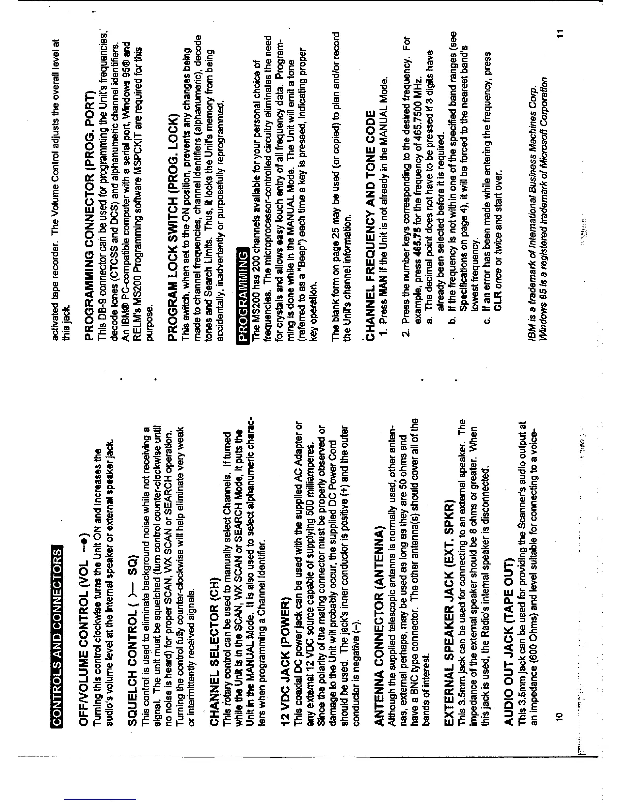 RELM MS200 - CONTROLS AND CONNECTORS; OFF;VOLUME CONTROL; SQUELCH CONTROL; CHANNEL SELECTOR