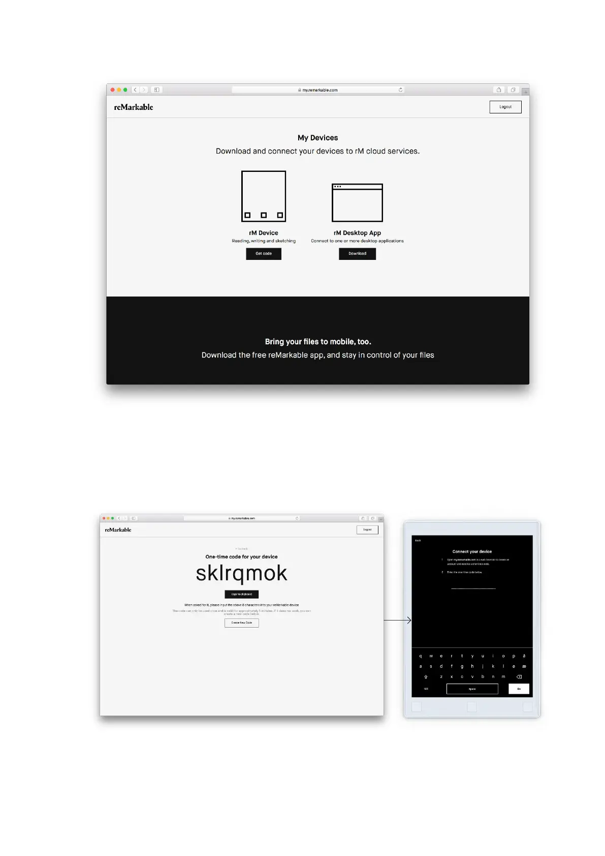5. Enter the one-time code on your reMarkable device, and tap Go