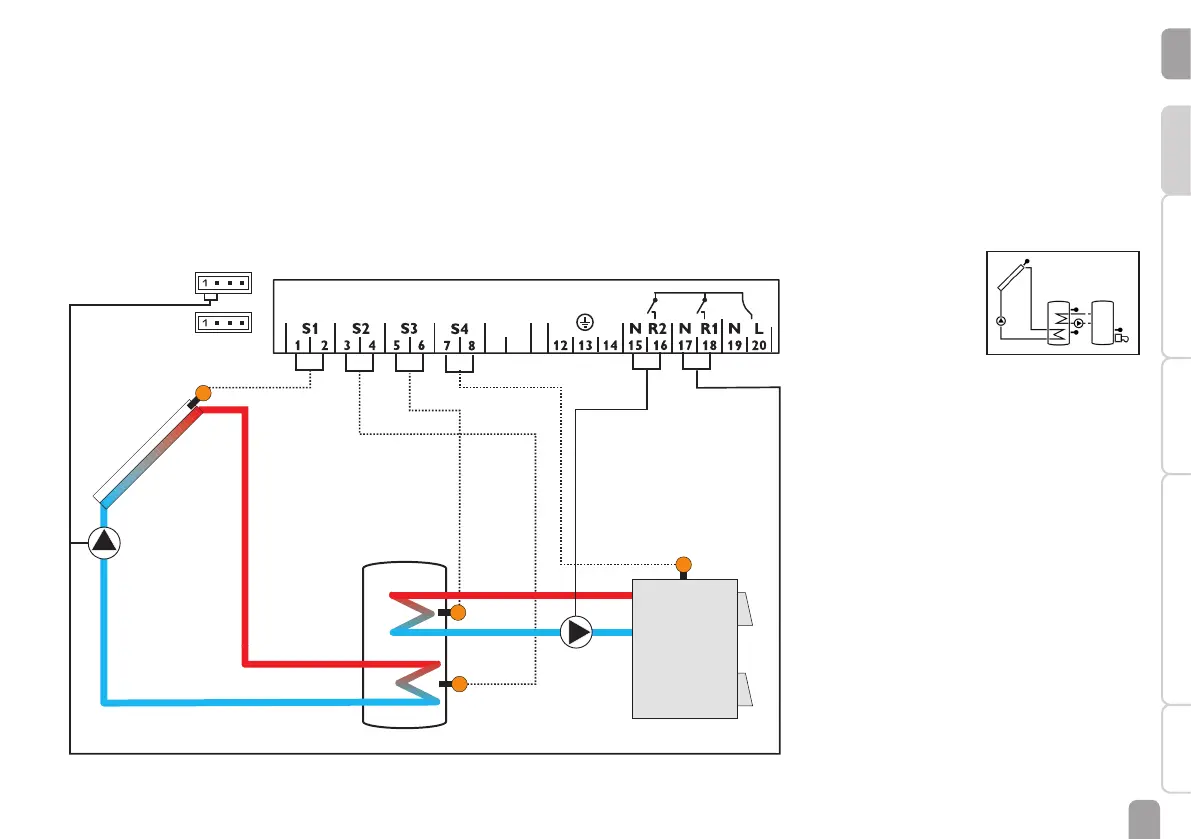 A solid fuel boiler will be controlled by relay 2, if the temperature difference be-