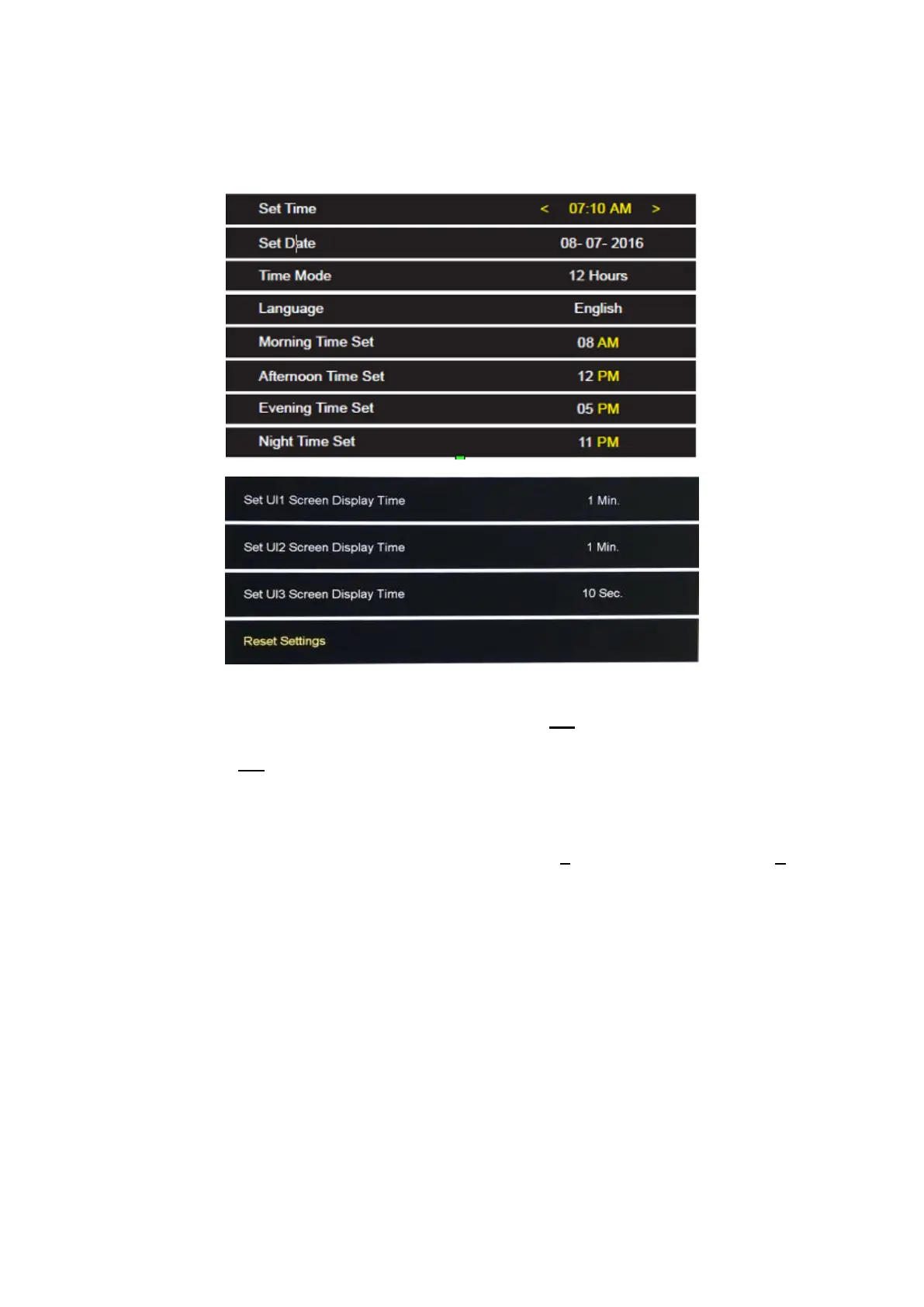 Press buttons LEFT or RIGHT to highlight the Day: <08 - 07 - 2016 > or <07 - 08-