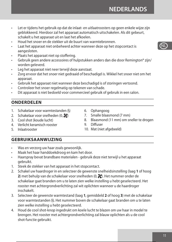 • Gebruik geen andere accessoires of hulpstukken anders dan die door Remington® zijn/
