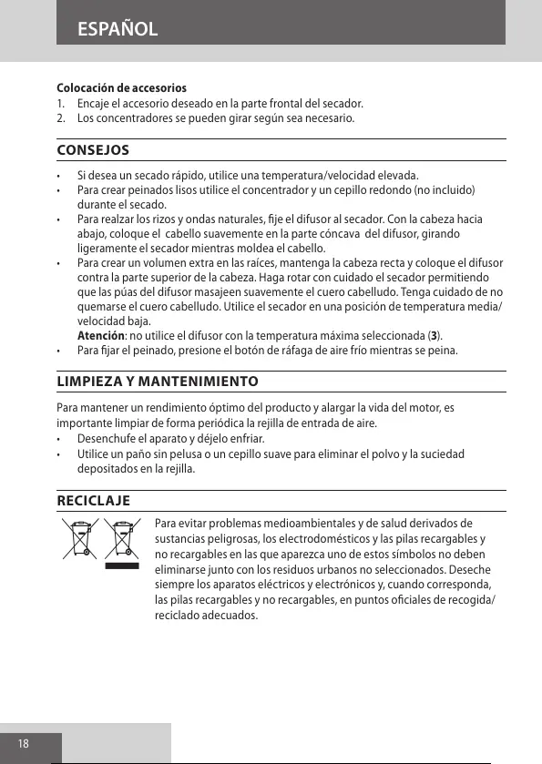 • Para realzar los rizos y ondas naturales, je el difusor al secador. Con la cabeza hacia