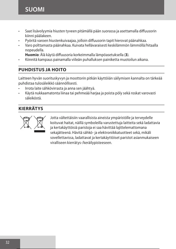 • Varo polttamasta päänahkaa. Kuivata hellävaraisesti keskilämmön lämmöllä/hitaalla