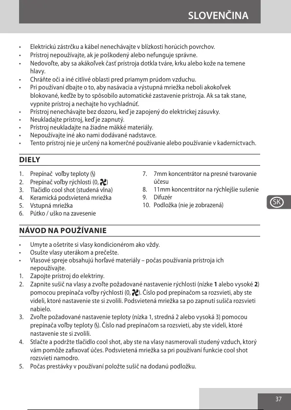 • Tento prístroj nie je určený na komerčné používanie alebo používanie v kaderníctvach.