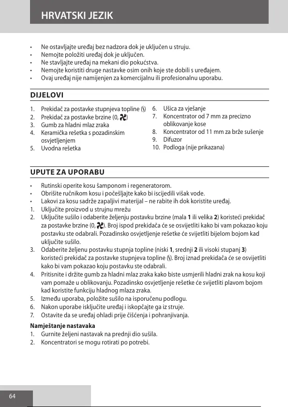 • Lakovi za kosu sadrže zapaljivi materijal – ne rabite ih dok koristite uređaj.