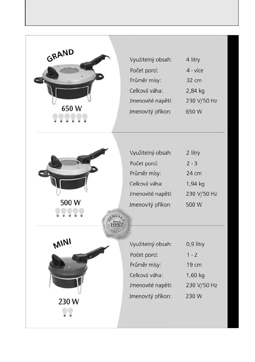 REMOSKA Original - Product Specifications; Remoska GRAND Specifications; Remoska MINI Specifications