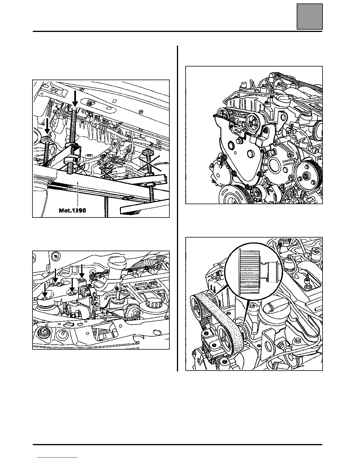 Insert the mounting tool Mot. 1390 under the engine