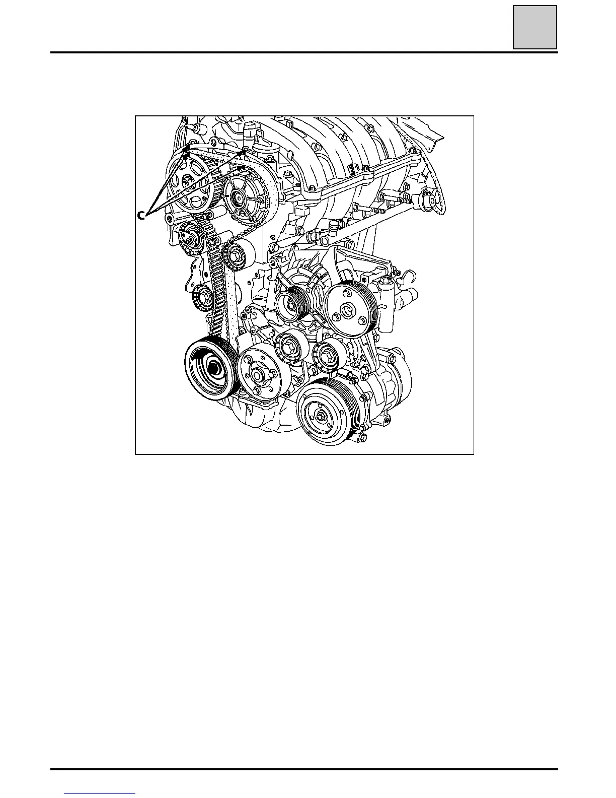 Using a pencil, make a mark (C) between the camshaft pulleys and the