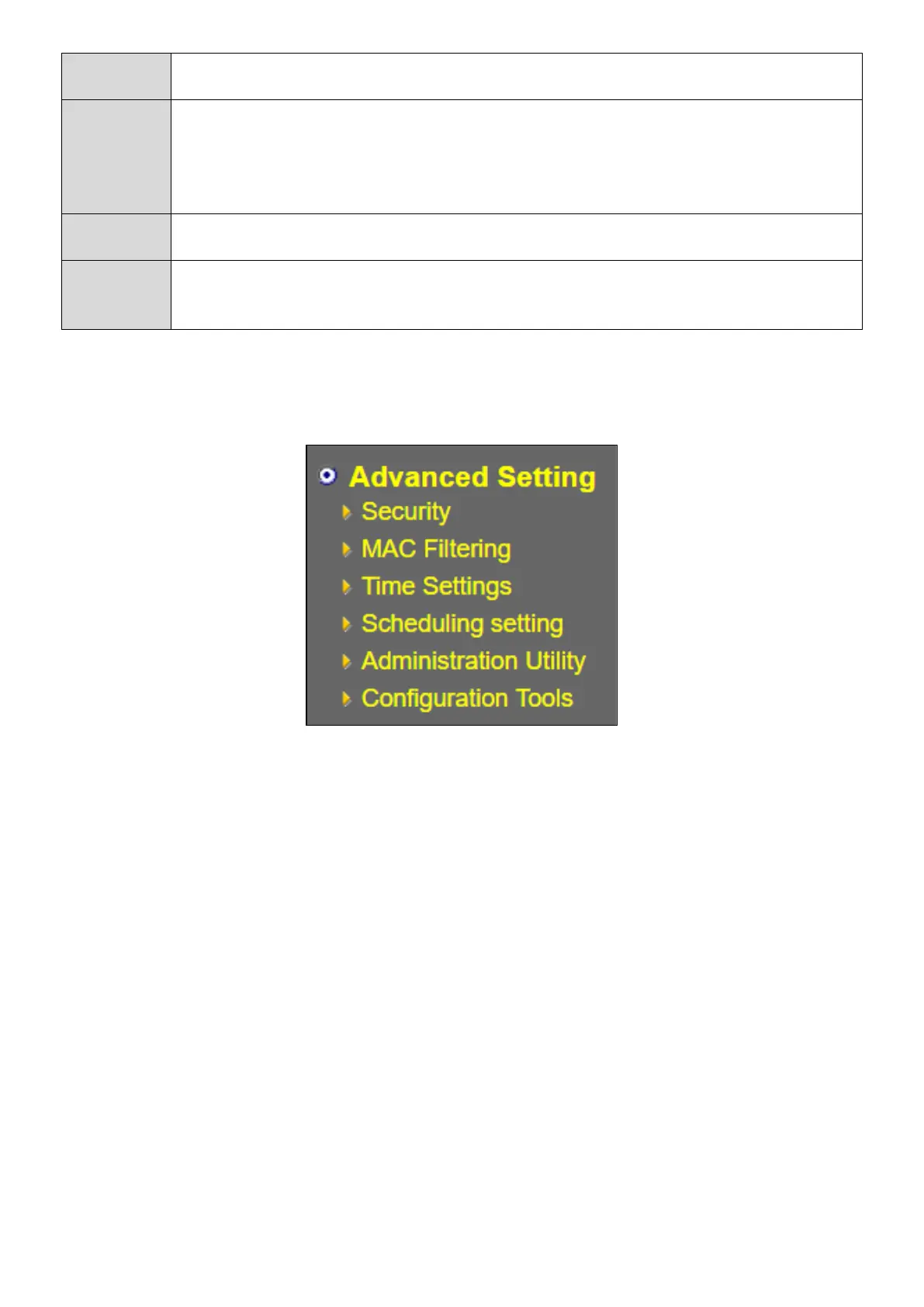 The menu of the Advanced Setting is shown below, with the following sections containing the viewable