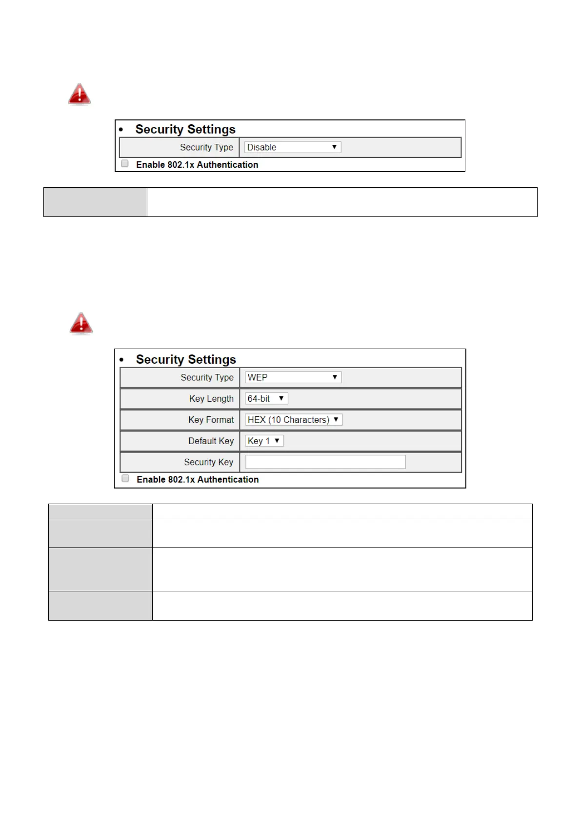 “Disable” is selected as the security type where no password/key is required to connect to the unit.