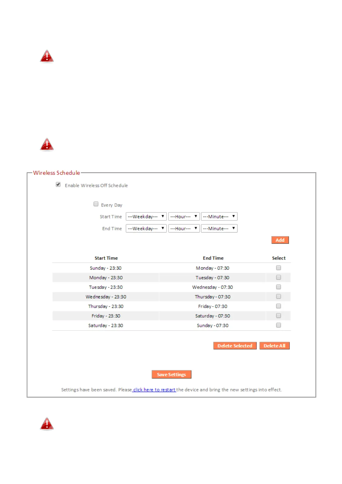times. Multiple schedules can be configured. Check/uncheck the box “Enable Wireless Off