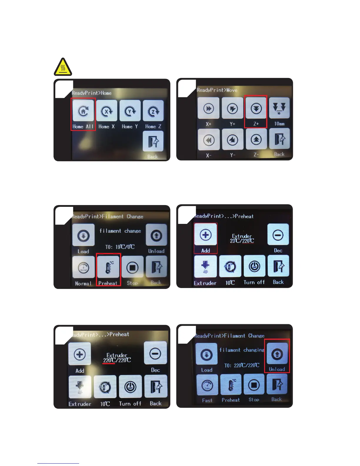 • Go back to the < Filament Change > menu, and