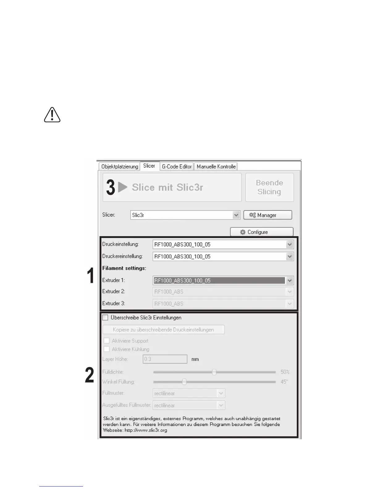 Example: RF1000_ABS300_100_05 = RF1000_3mm ABS_layer thickness 100 µm (= 0.1 mm)_nozzle diameter 0.5 mm