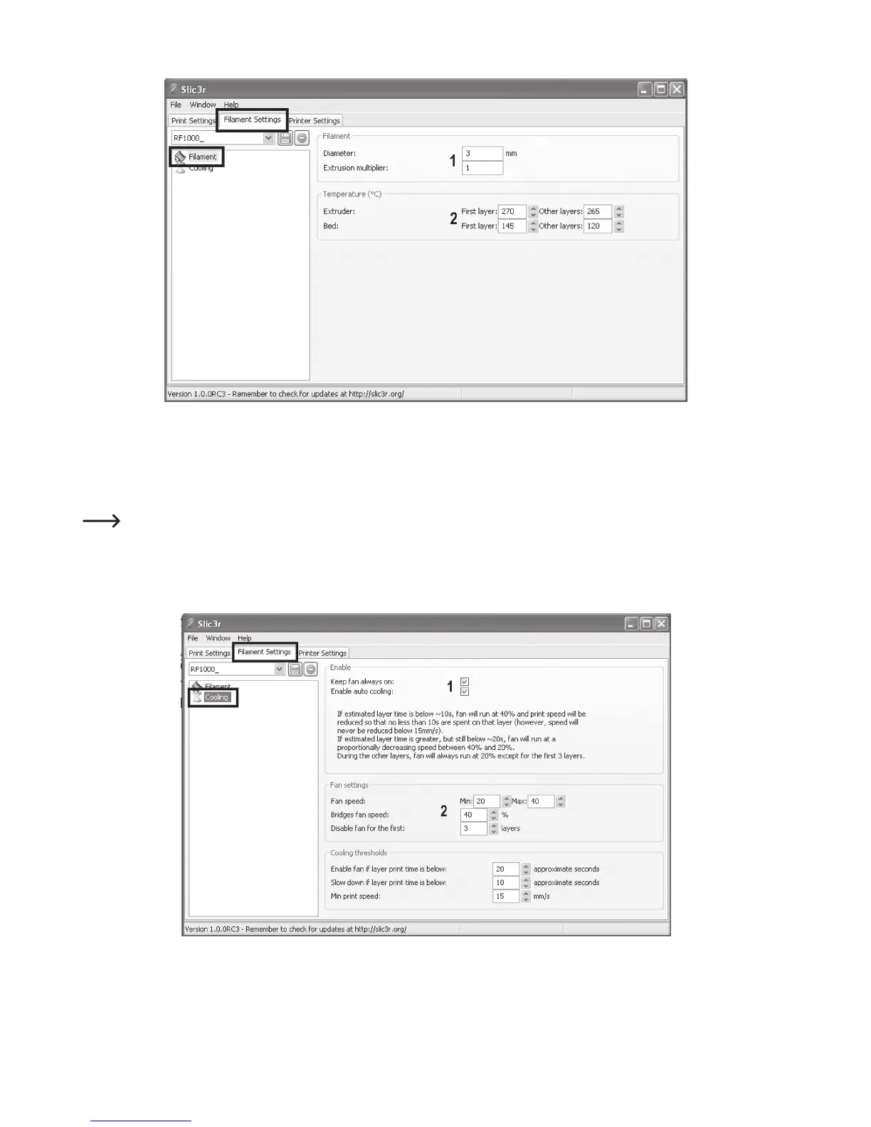 (1) Filament diameter and filament diameter tolerances according to the manufacturer specification are set here. If no
