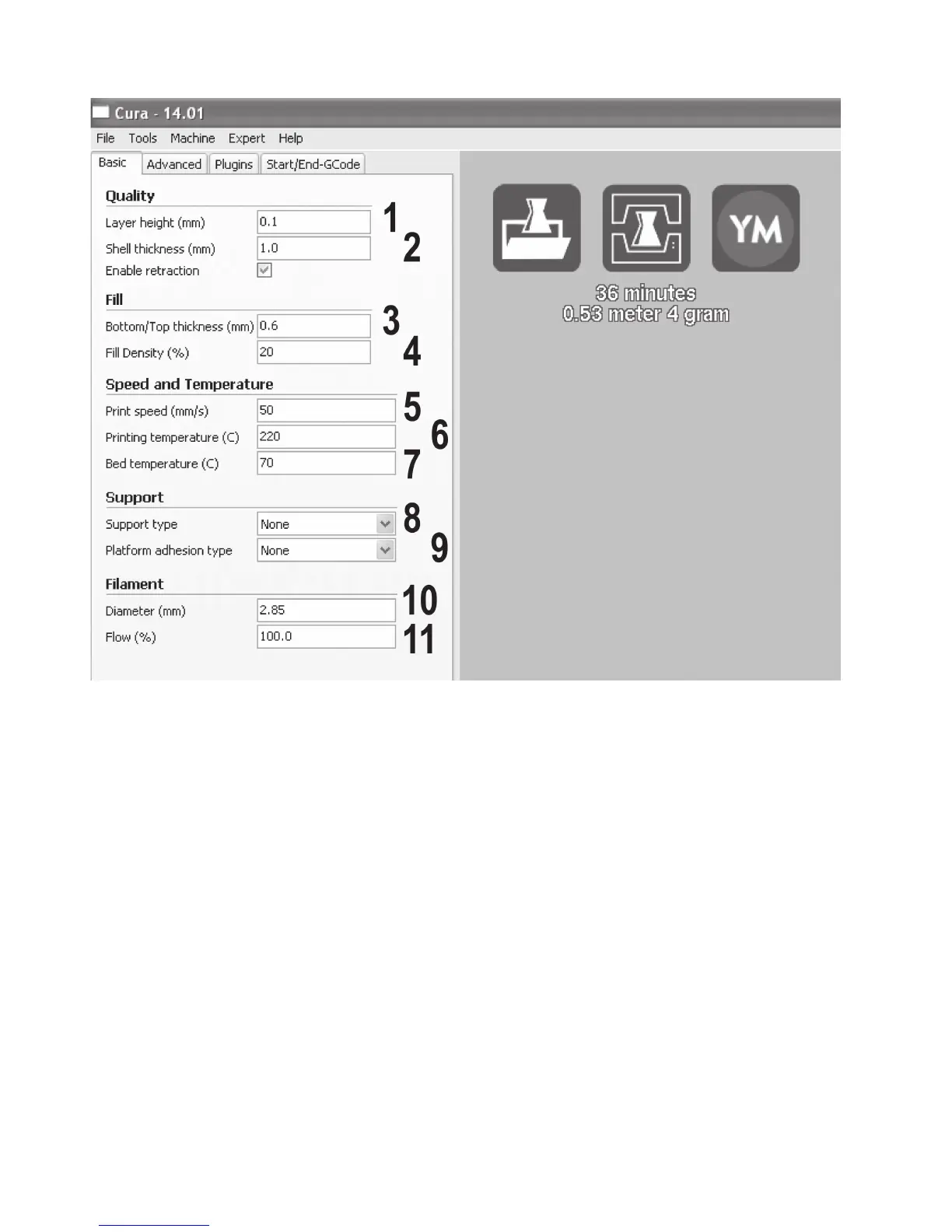 (9) Selection of additionally printed structures around the object to prevent coming loose from the heating bed, raising of