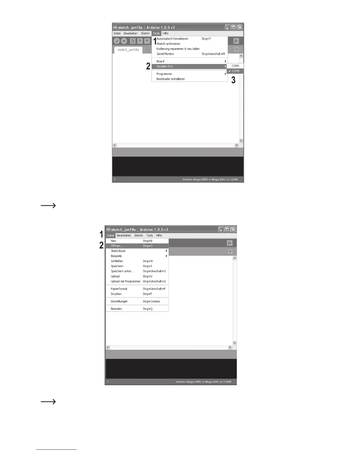 • In the menu “Tools”, select the option “Serial port” and set the correct port.