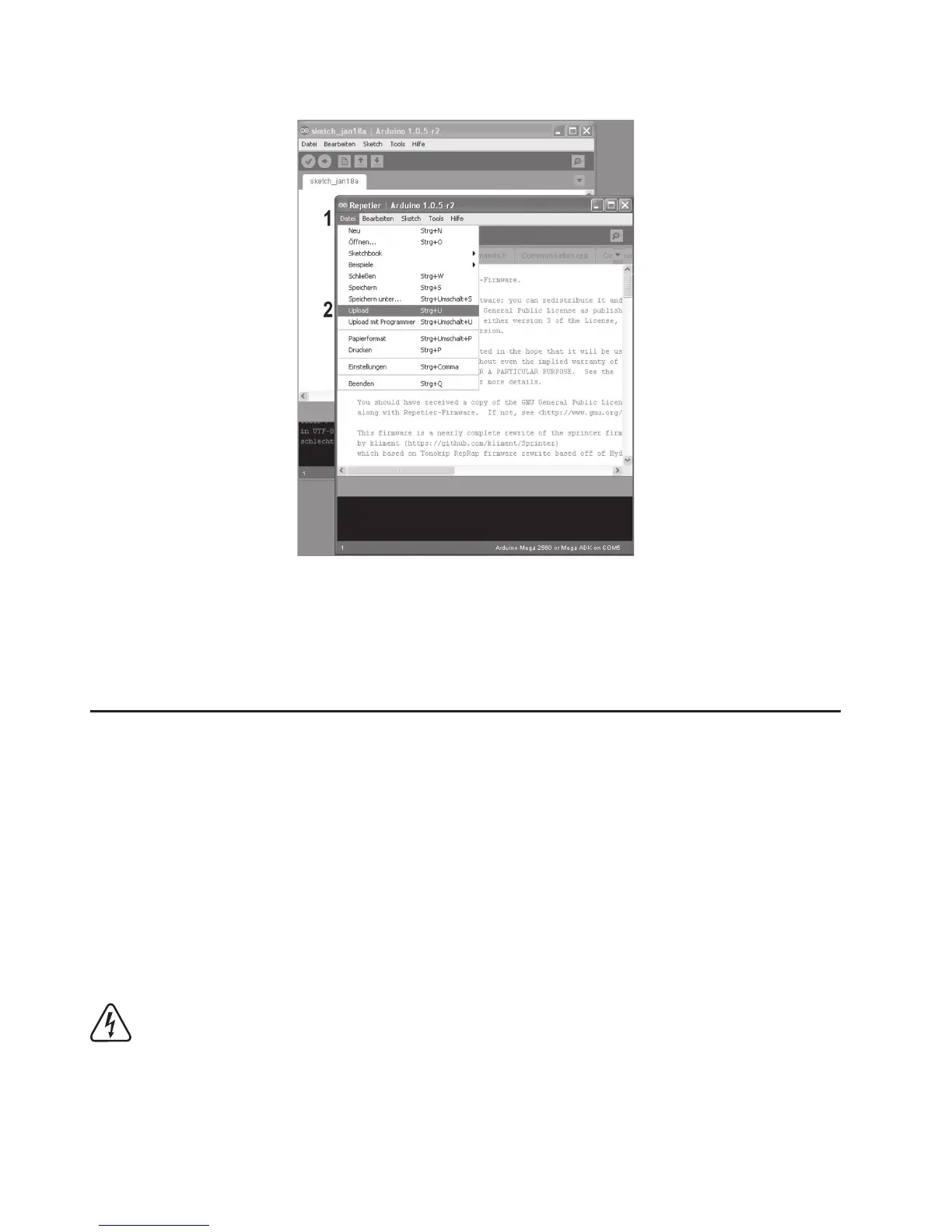 • Click “Upload” in the menu “File” here to transfer to the new firmware to the 3D printer.