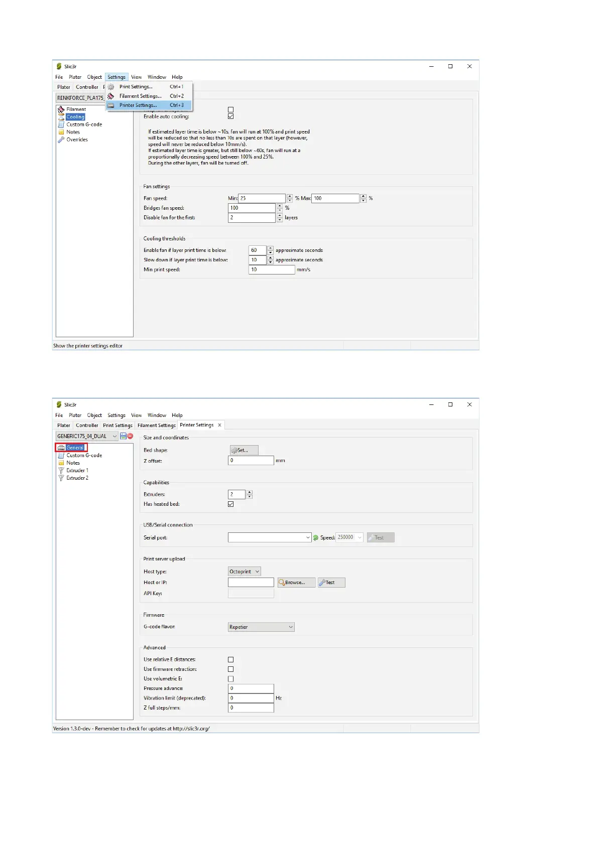 Click the menu "Settings" (1) in the slicer window and open the item "Printer Settings..." (2).