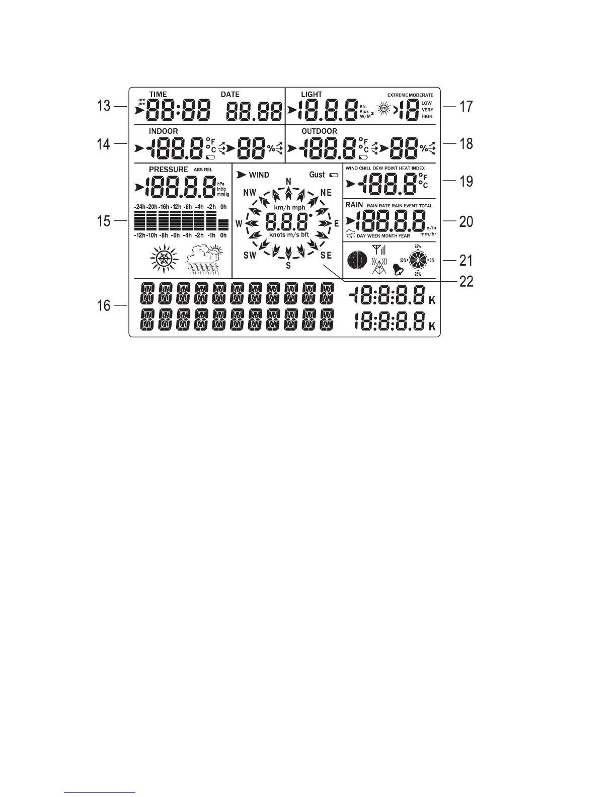 21 Moon phase, storage display, symbol for DCF radio reception, symbol for receiver of the outdoor sensor signal,