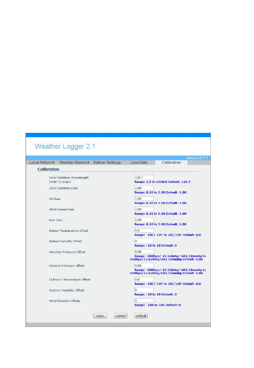Select the Calibration tab to view your calibration data from the weather station. Select the Apply button