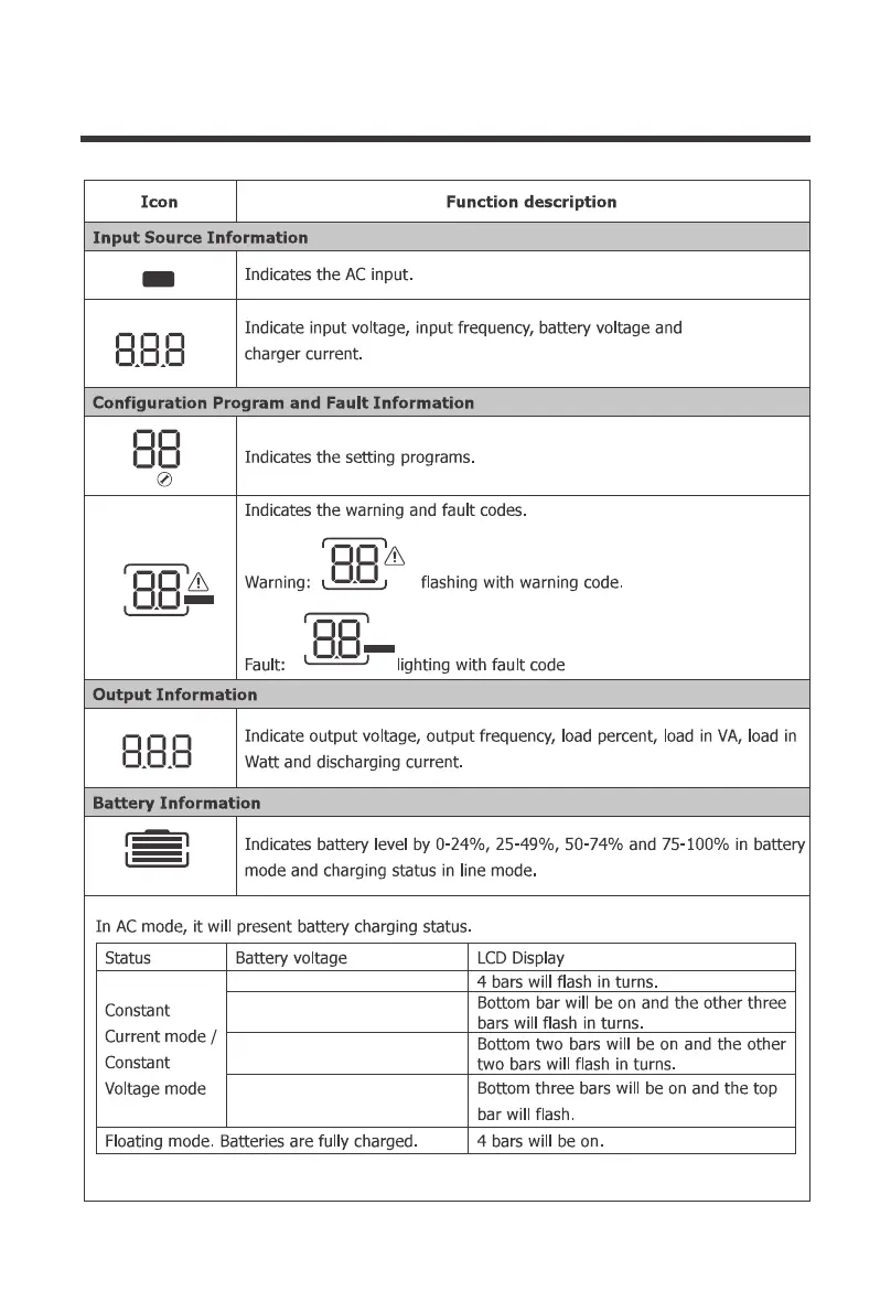 Renogy 2000W - Input Source Information; Configuration Program and Fault Information; Output Information; Battery Information