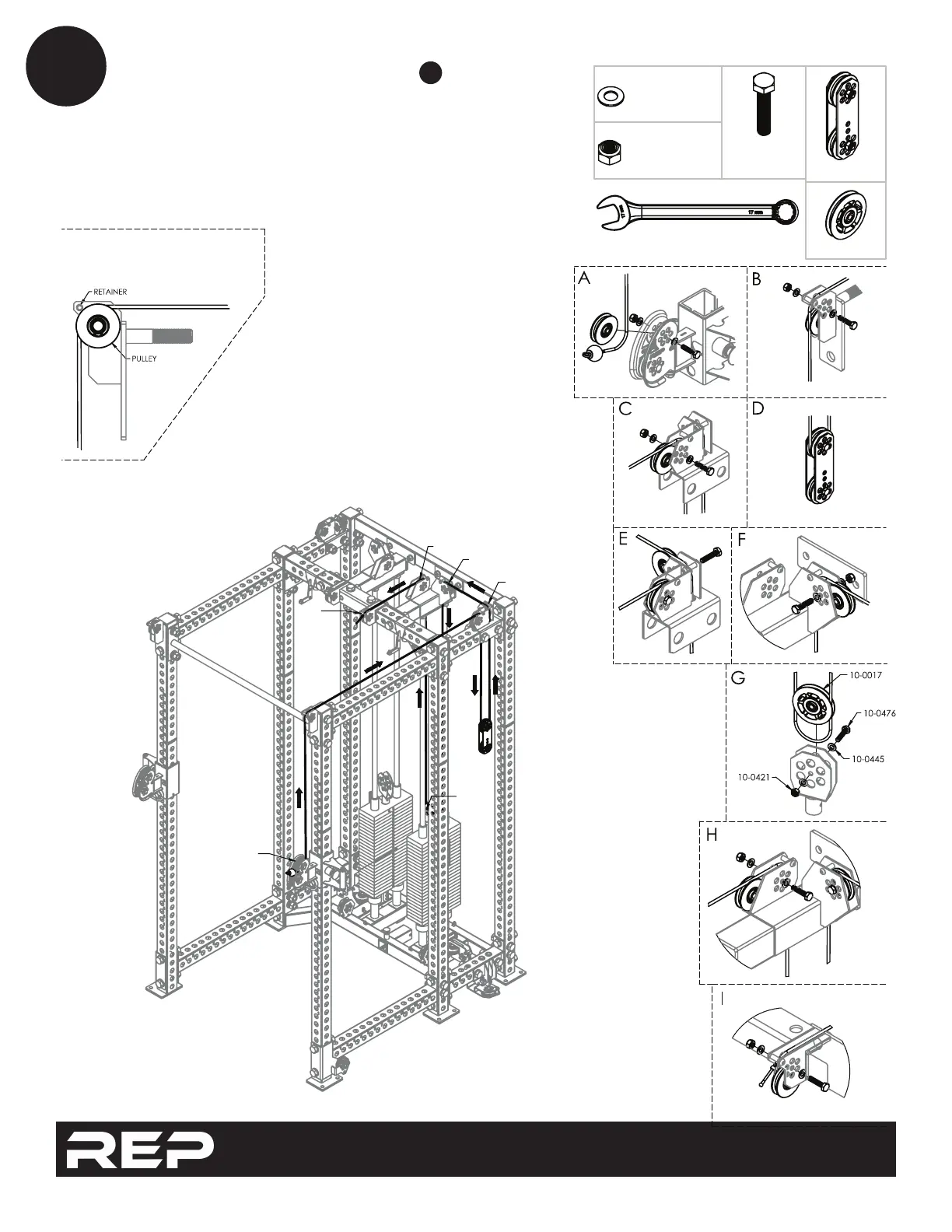 -REMOVE HARDWARE AND PULLEYS AS NECESSARY.