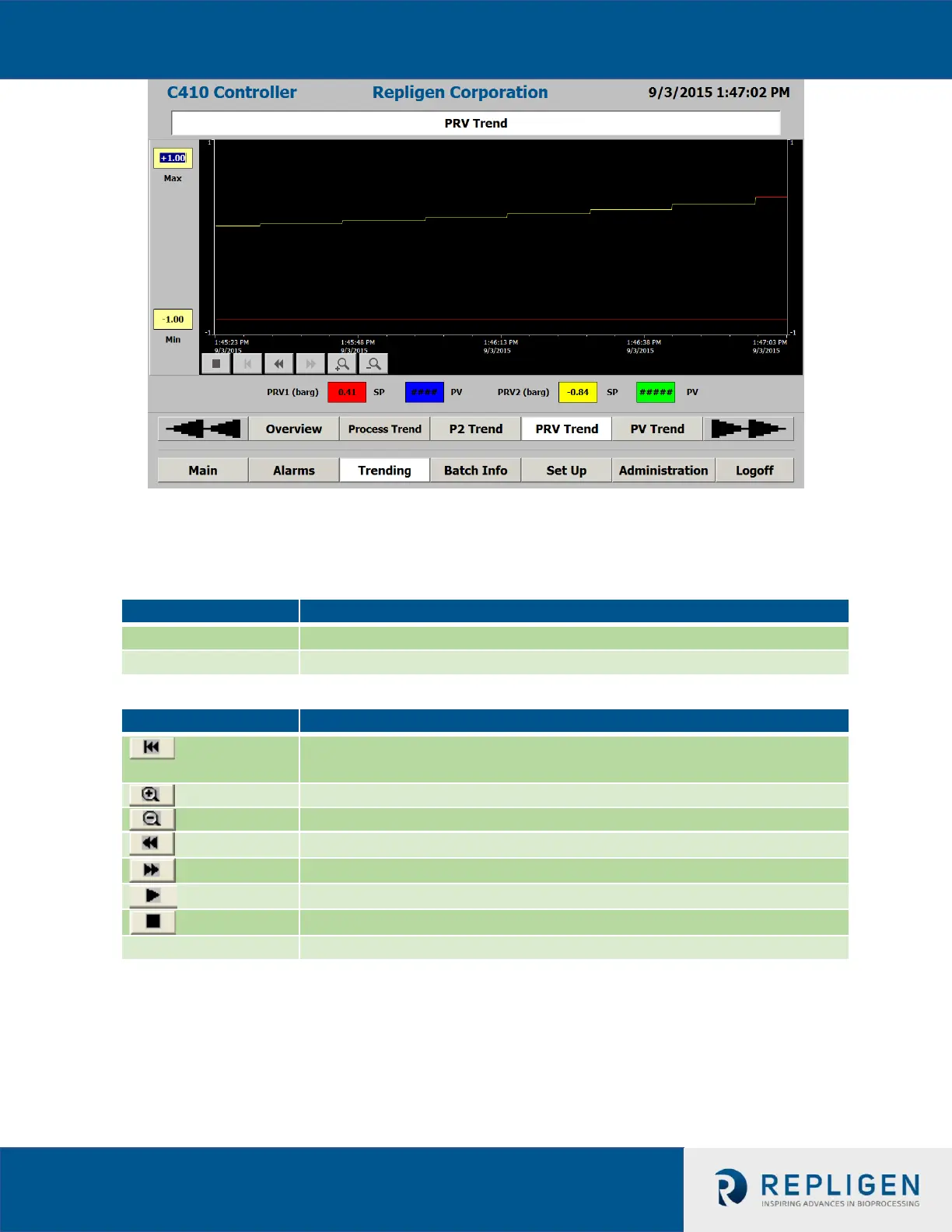 These screens monitor, in real time, the specific analog signal. Trend buttons select trend to