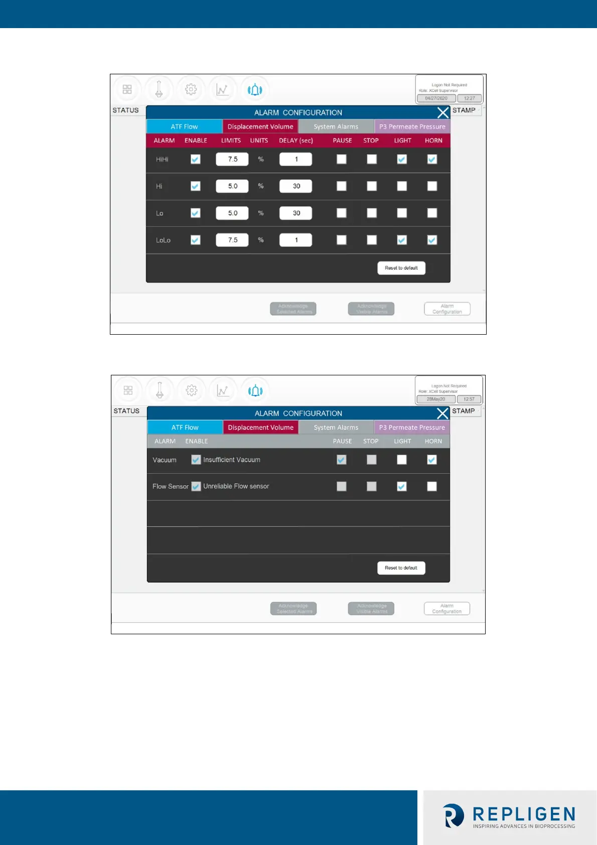 REPLIGEN XCell Lab XC-LAB-S - Figure 49. Default Values for Displacement Volume Alarms; Figure 50. Default Values for System Alarms