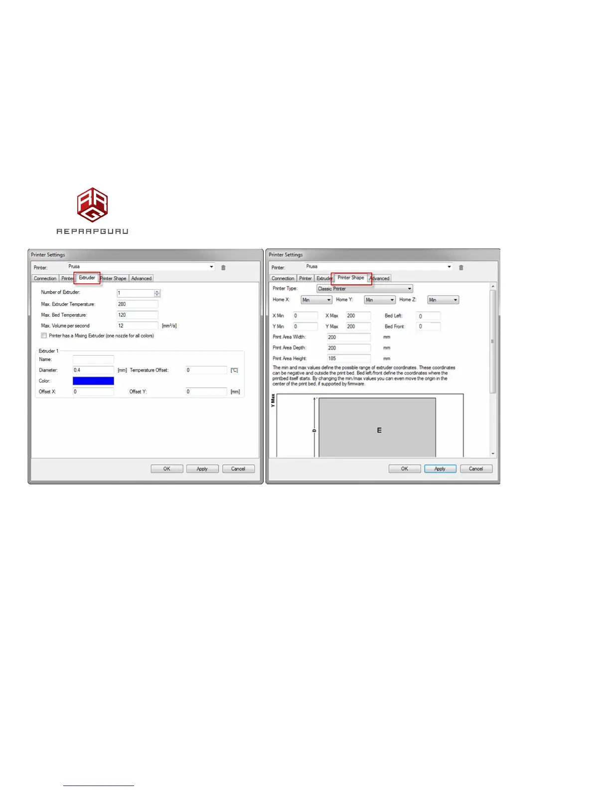 RepRap Guru Prusa i3 - Printer Settings: Extruder & Shape Tabs