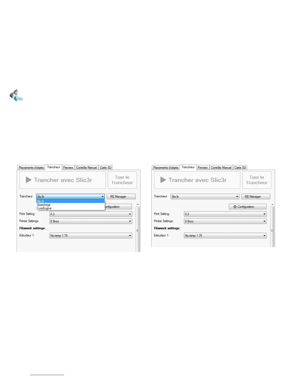 Go in the tab« Slicer » and select the slicer« Slic3r». Next click on «conguration», and go in the tab «Printer Settings», click on «Custom G-code».