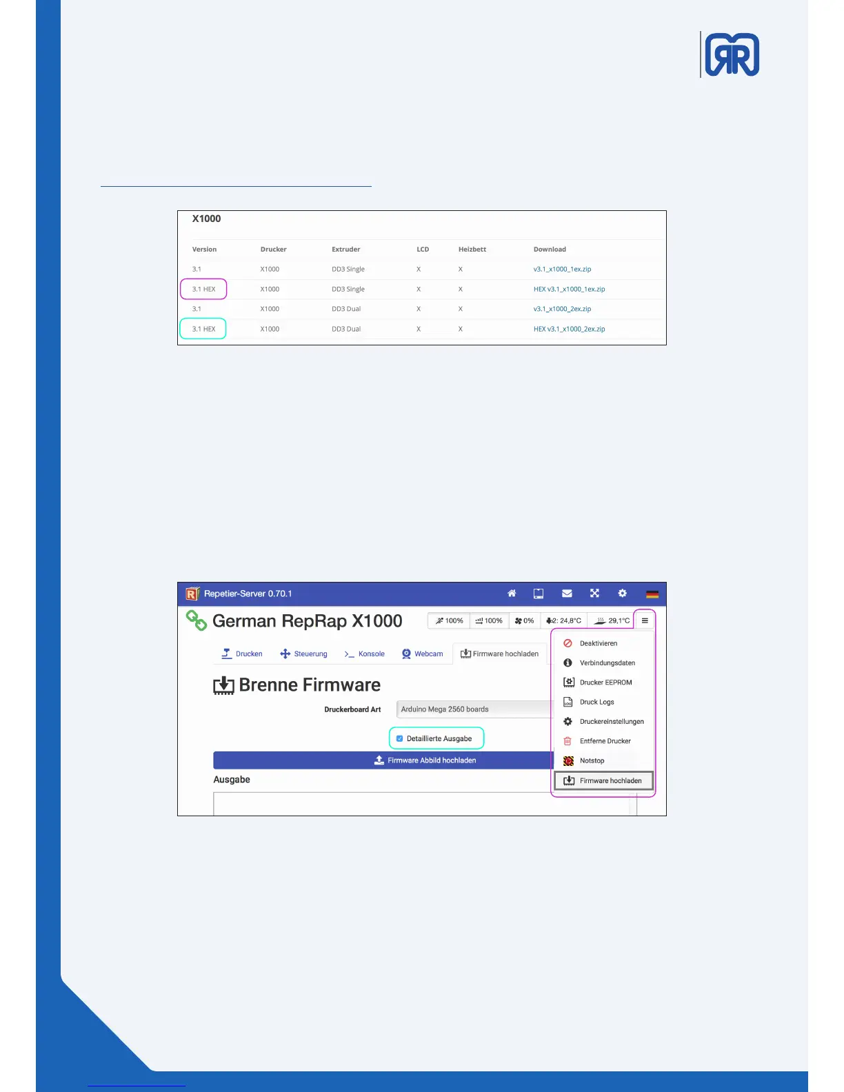 right corner to open the advanced settings and click on “rmware hochladen”: