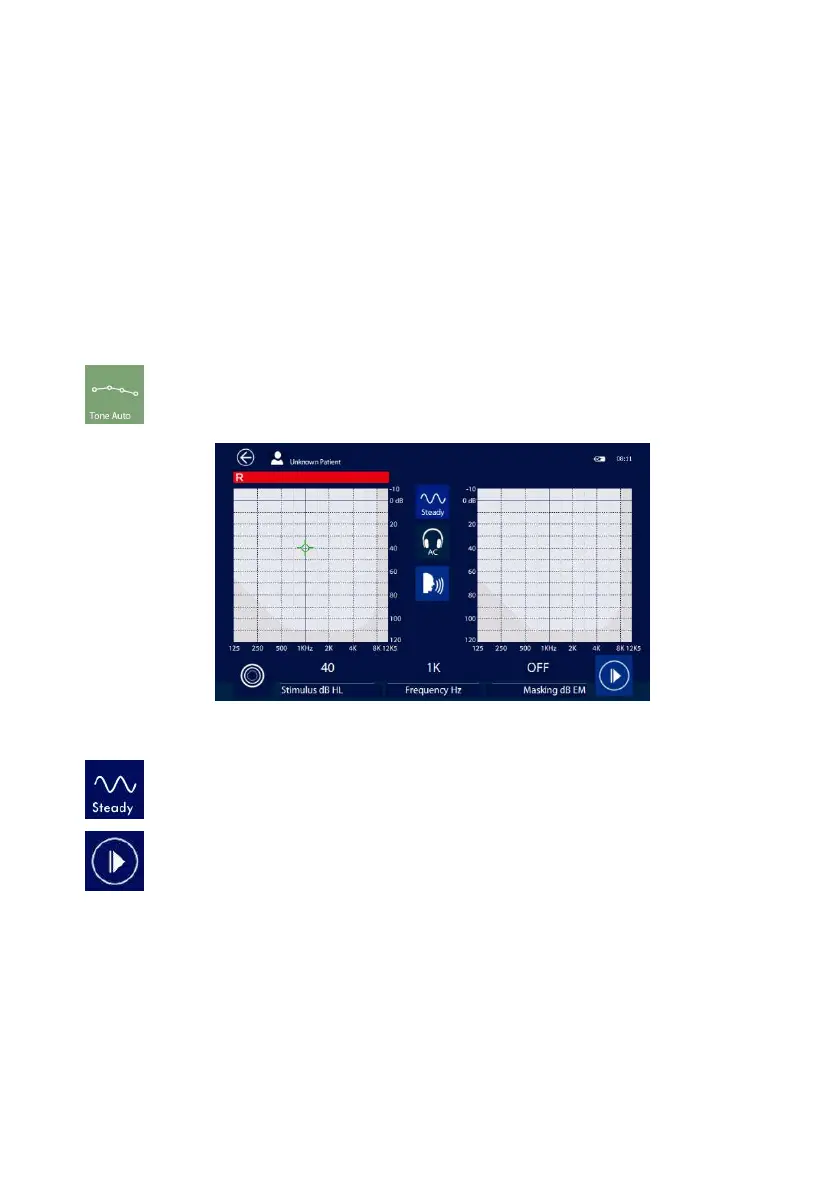 Press the START icon to start the test, automatically the device will generate a 40 dB HL 1 KHz