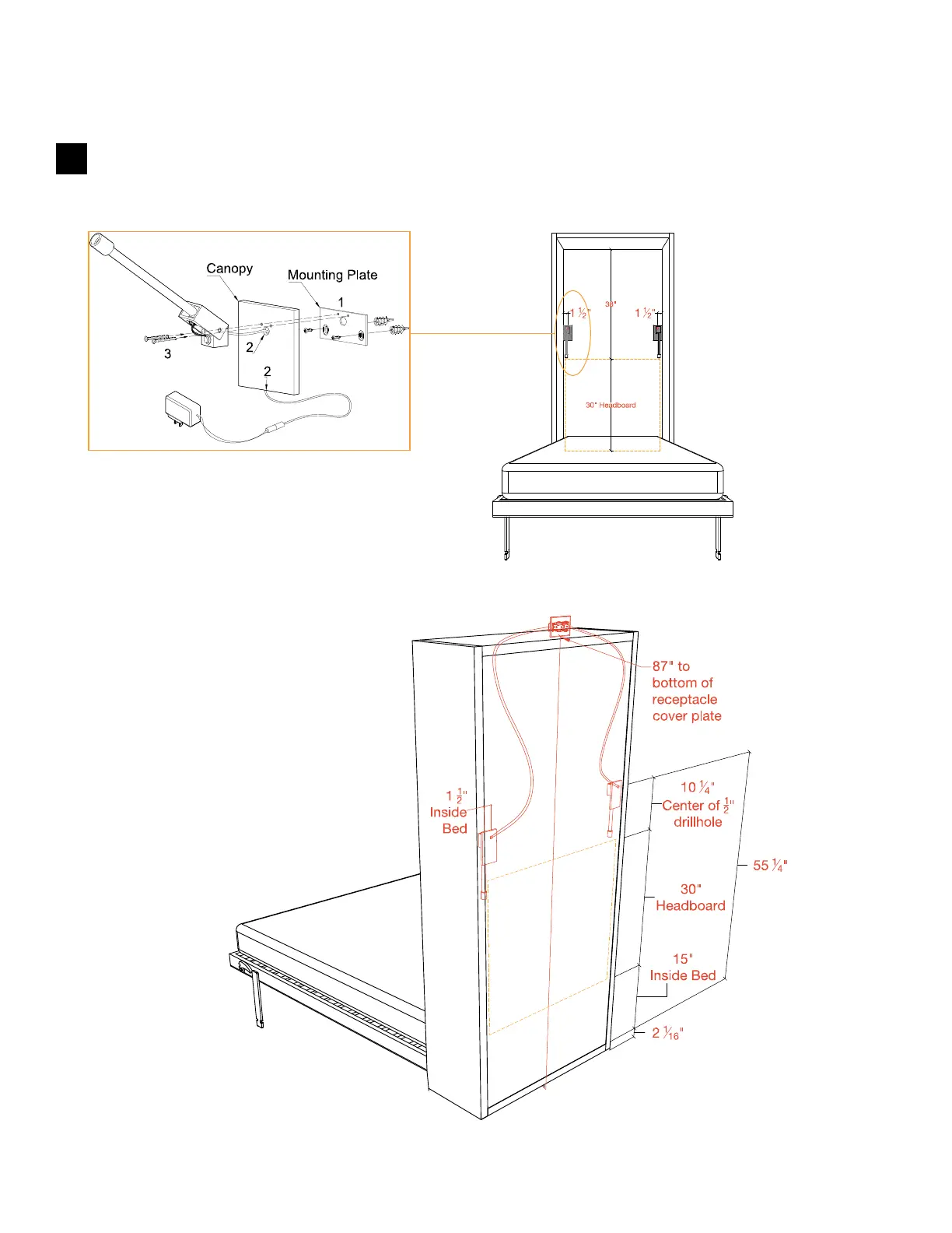 • Drill 1/2” hole at 10 1/4” above headboard and 1 1/2” in from the side