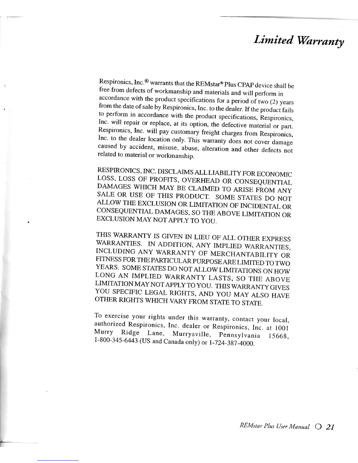 authorized Respironics, Inc. dealer or Respironics, Inc. at 1001