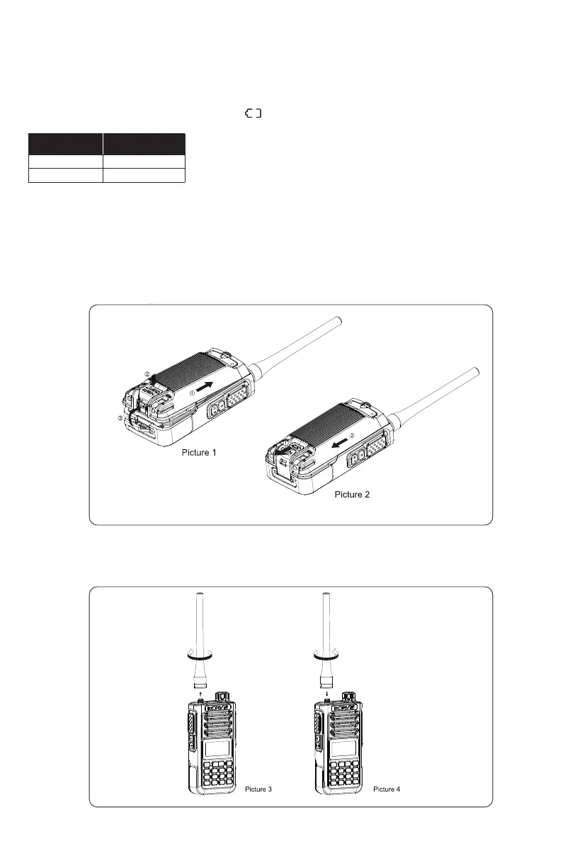 1. Align the threaded end of the antenna and the threaded hole at the top of the radio, and rotate the antenna clockwise until it is tight.