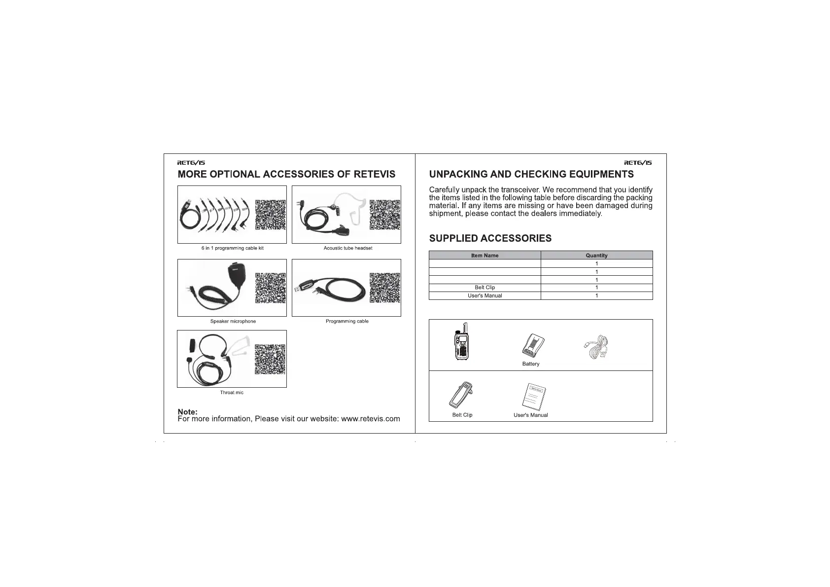 Retevis RB18 - Equipment Unpacking and Setup; Supplied Accessories