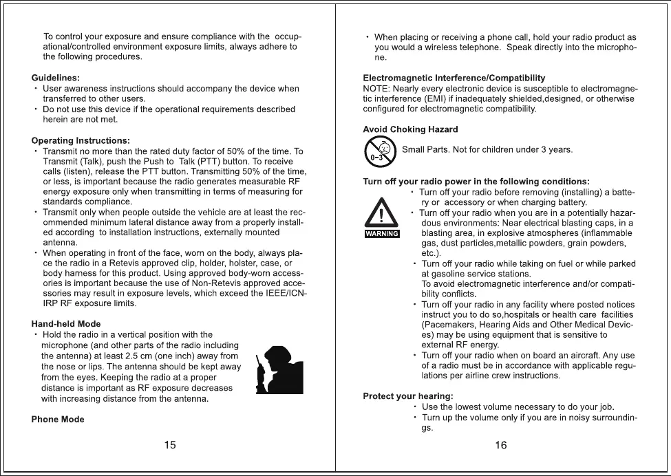 Retevis RB26 - Electromagnetic Interference and Hazards; Turn Off Radio in Hazardous Conditions; Protect Your Hearing