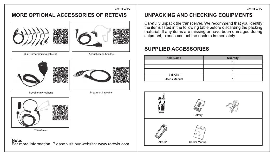 Retevis RB618 - More Optional Accessories of Retevis; Unpacking and Checking Equipment; Supplied Accessories