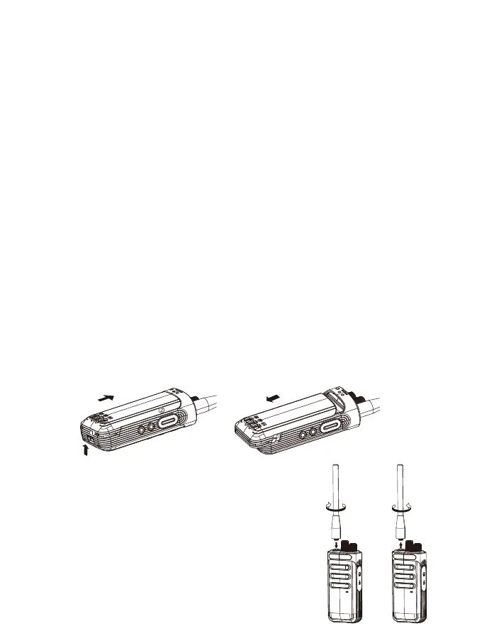Per installare la batteria nel foro di posizionamento della batteria del fondo della radio, quindi premere la