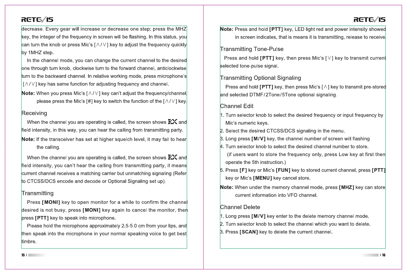 Retevis RB86 - Receiving Signals; Transmitting Operations; Transmitting Tone-Pulse and Optional Signaling; Channel Management: Edit and Delete