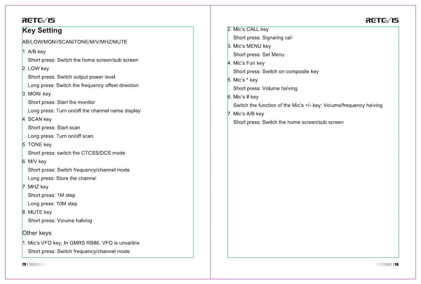 Retevis RB86 - Key Setting Functions; Primary Key Functions