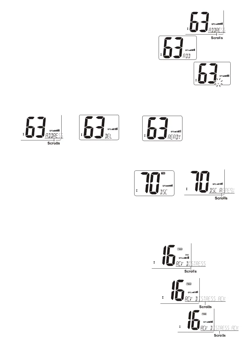 2. "DSC" apparaît et "RCV DISTRESS" défile sur l'indicateur de commentaire de