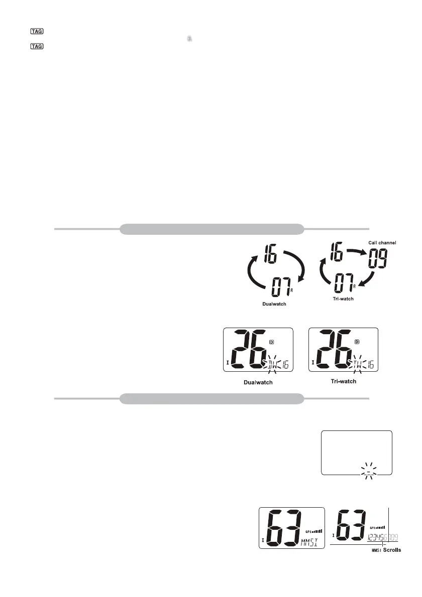 3. Tenere premuto [CH/WX] per 1 secondo. per avviare Dualwatch o Tri-watch.