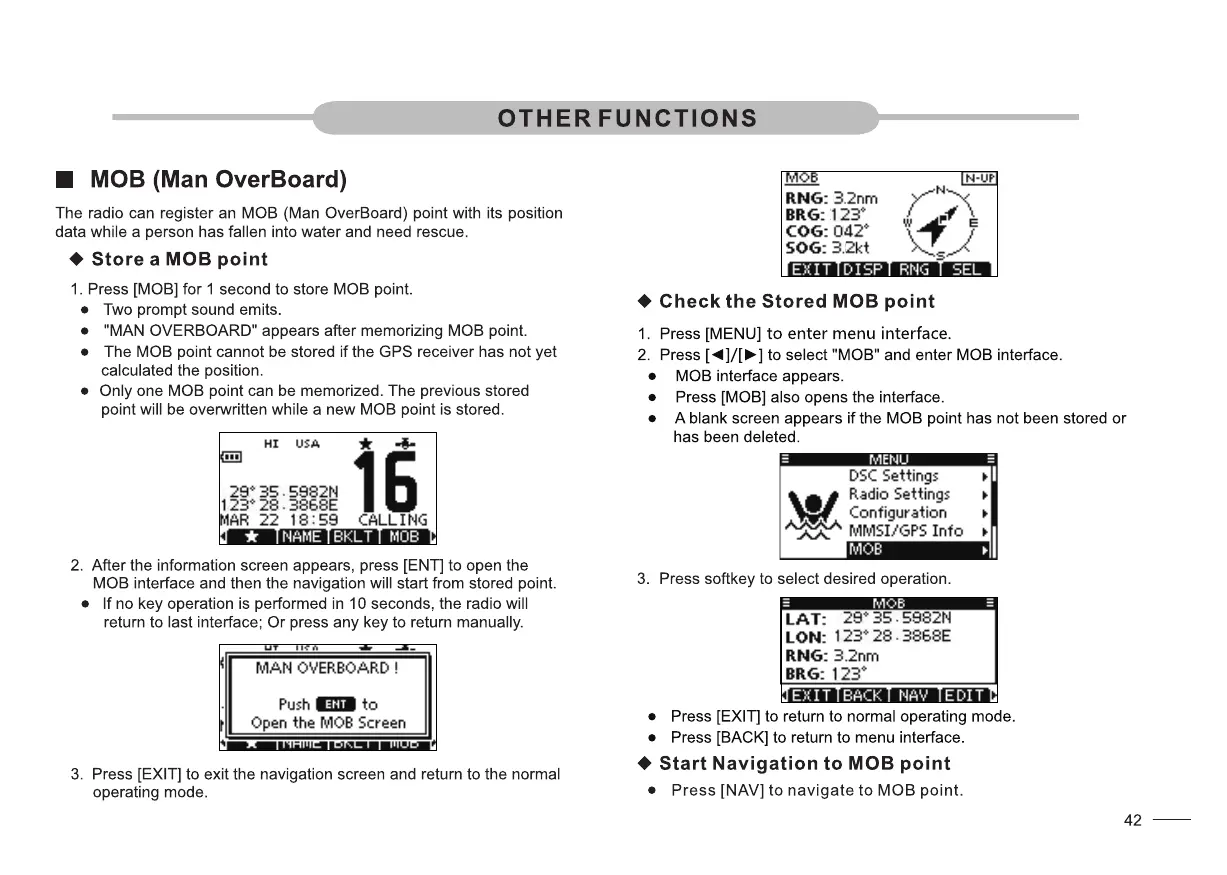 Retevis RM40 - OTHER FUNCTIONS; MOB (Man OverBoard); Store a MOB point; Check the Stored MOB point