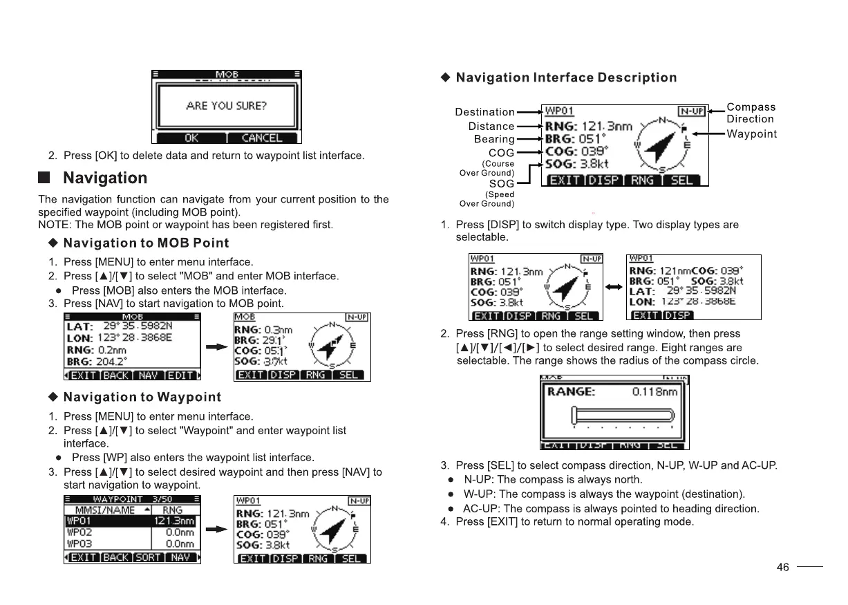 Retevis RM40 - Navigation Interface Description; Navigation; Navigation to MOB Point; Navigation to Waypoint