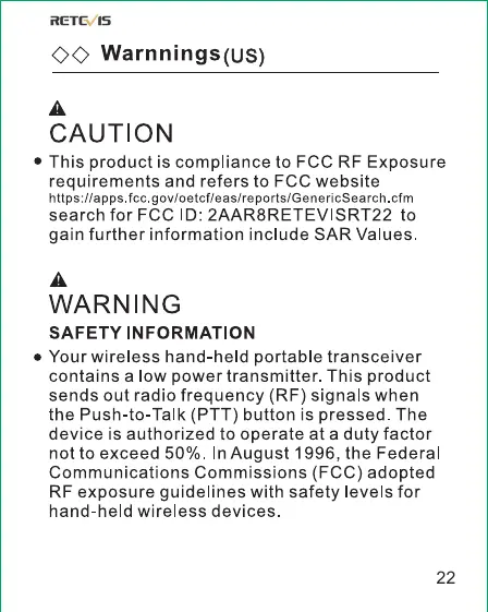 Retevis RT22 - FCC Safety Information and Transmitter Limits