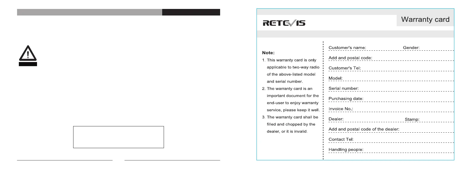 • Póngase en contacto con Retevis para obtener ayuda con las reparaciones y el servicio.