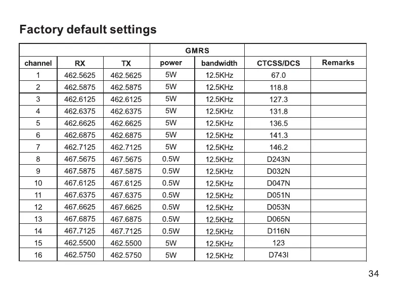 Retevis RT76P - Factory Default Settings (Part 1); GMRS Channel Defaults (1-16)