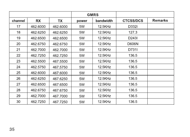 Retevis RT76P - Factory Default Settings (Part 2); GMRS Channel Defaults (17-30)