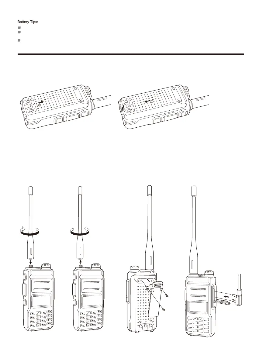 1)Align the threaded end of antenna and the threaded hole at the top of radio, rotate the antenna clockwise until it is tight.(picture 3)